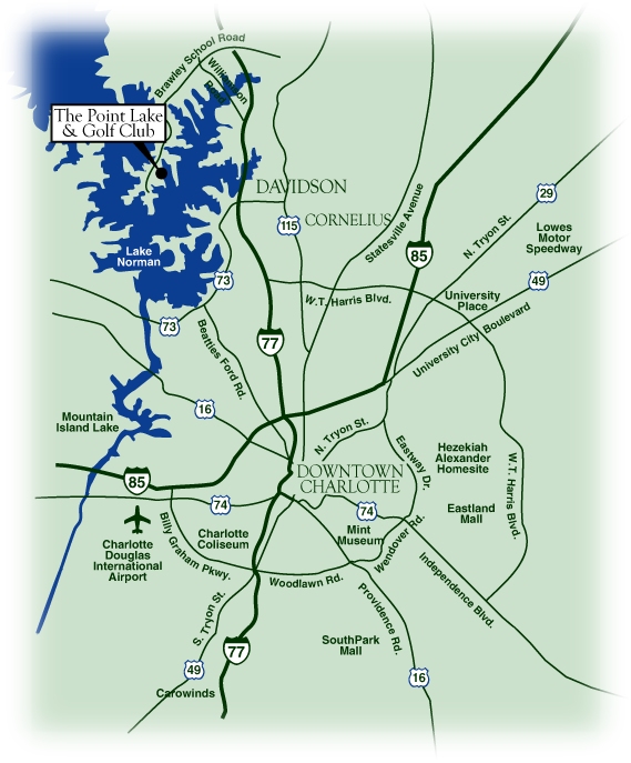 |   |   Directions: Follow I-77 to exit 33 (Lake Norman.) Go west on Williamson Road. Turn left on Brawley School Road and follow it approximately five miles to The Point. At the traffic circle, take your third right onto The Point Drive. Turn right on Queen Anne Circle, where you will see The Point Lake and Golf Club facilities. | |||